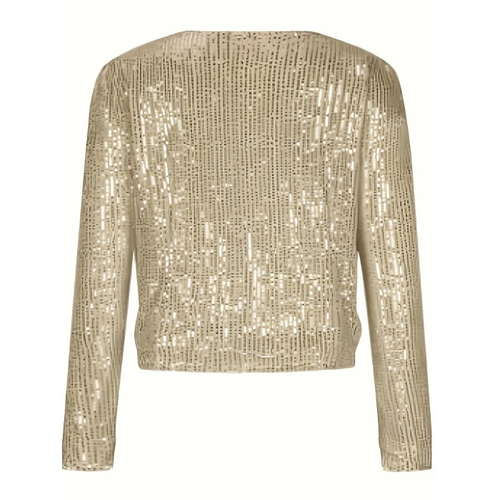 Sequined Solid Jacket, Casual Open Front Crew Neck Long Sleeve Outerwear, Women's Clothing