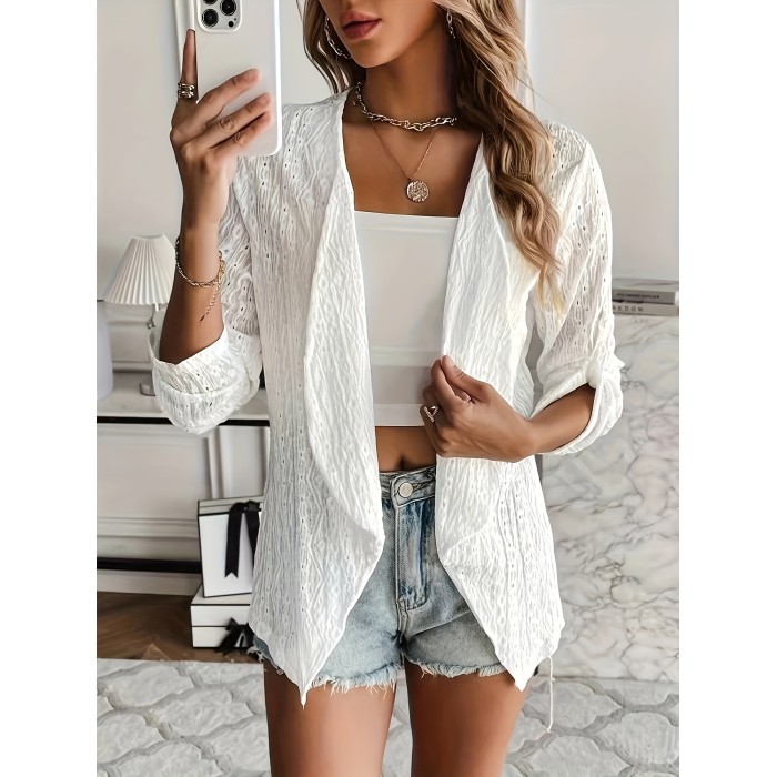 Solid Eyelet Open Front Blazer, Casual Lapel Long Sleeve Outwear For Spring & Fall, Women's Clothing