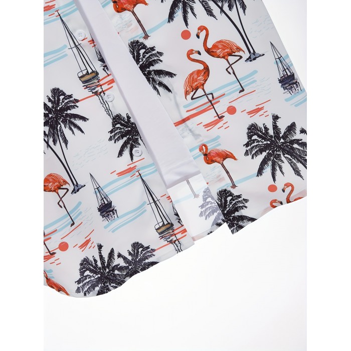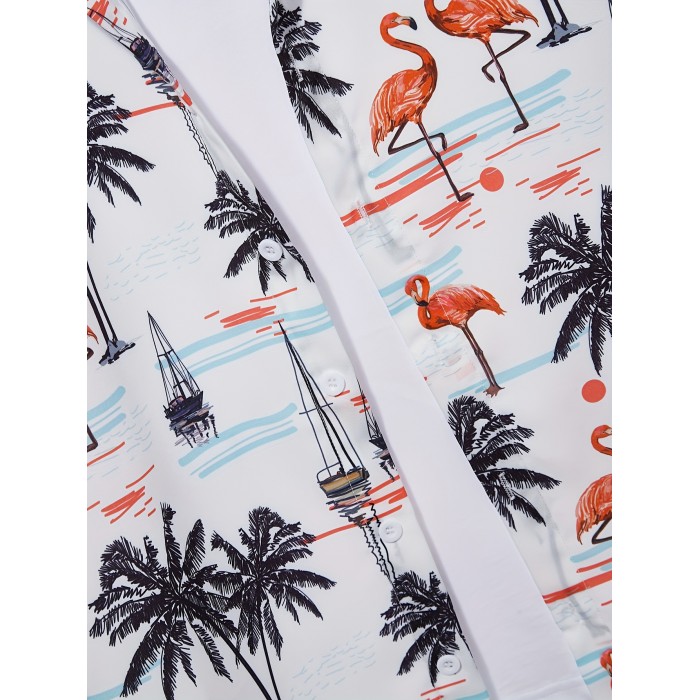 Men's Shirt Top, Flamingo & Coconut Tree Print, Camp Collar Bowling Shirts Short Sleeve Closure Summer Hawaiian Shirt Male Casual Button Up Shirt